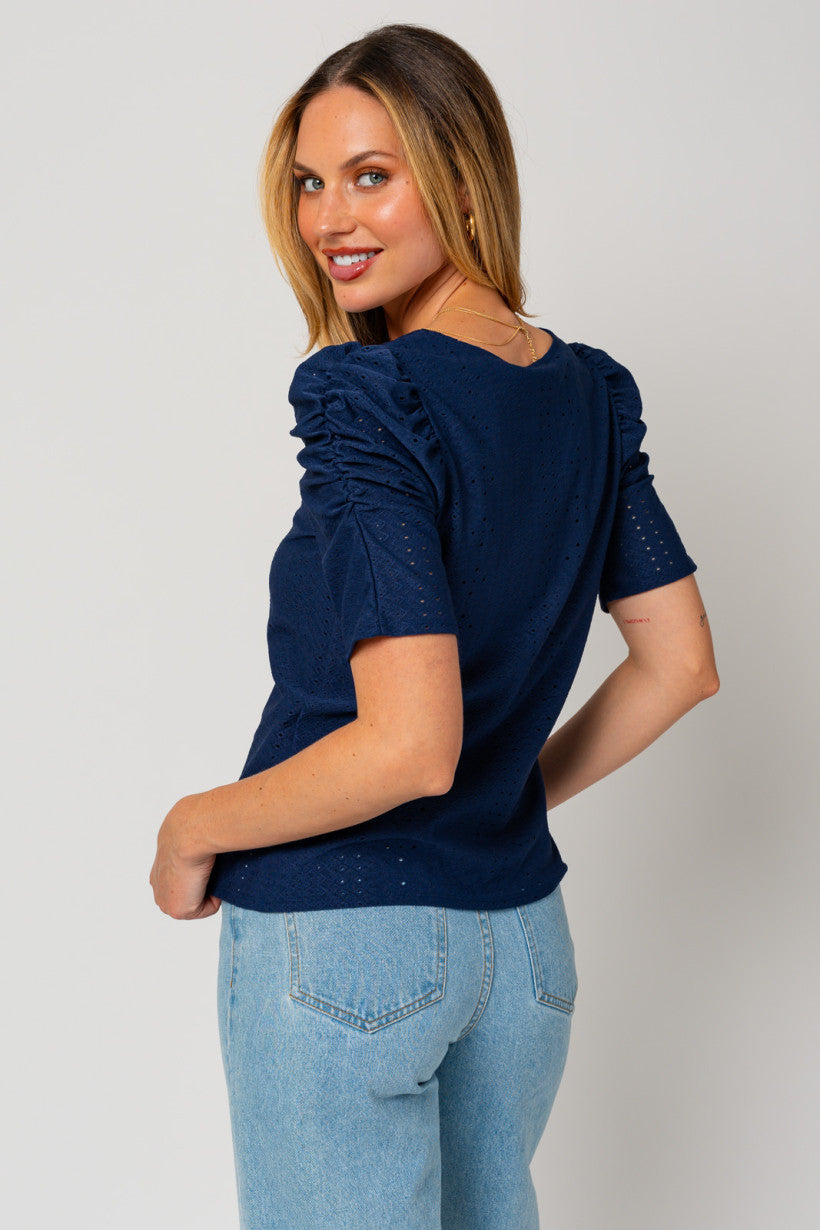 Look at this beautiful navy top, ladies! Three quarter sleeves with a fun ruche at the shoulders that goes down the sleeve, eyelet detail throughout the top, its lined, round neckline. This top would be a great addition to your wardrobe!