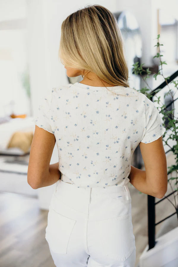 This short-sleeve tee features a classic crew neckline and a stylish lettuce hem, offering a fresh and flattering look for any casual outfit.