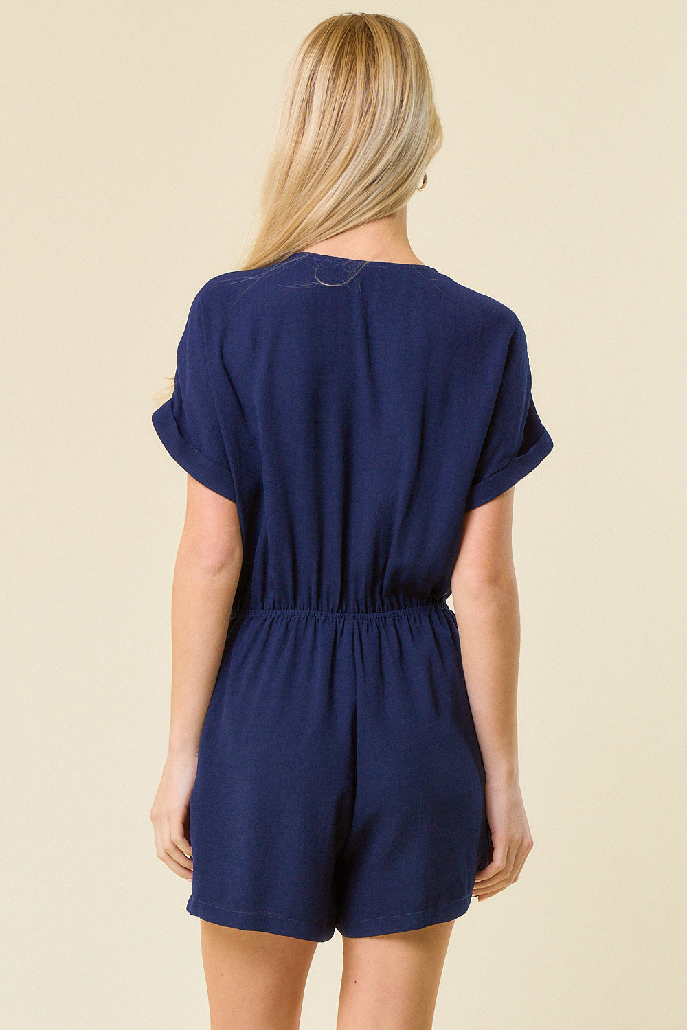 Check out this fun & flirty romper- ladies this one is SOOO CUTE!!! It has an elastic waist, so it cuts in just perfect, it has functional pockets, 3 functional buttons down the front, rolled sleeves and an ohhhhh so cute front tie! It comes in this beautiful navy color.