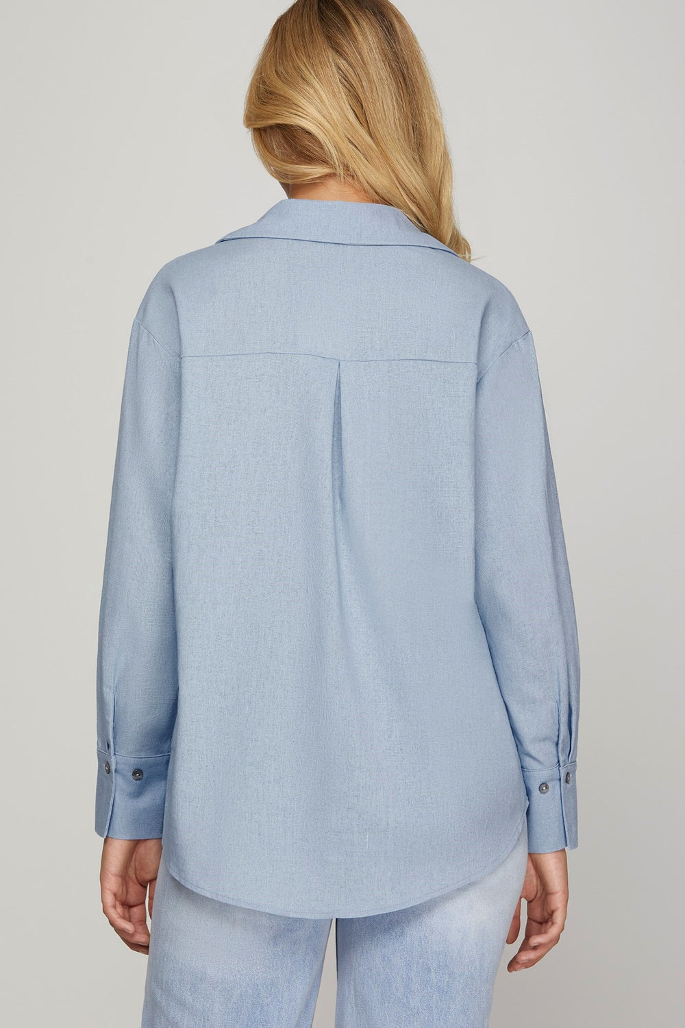 This woven top is designed with a convenient side pocket and features a long sleeve button down design.