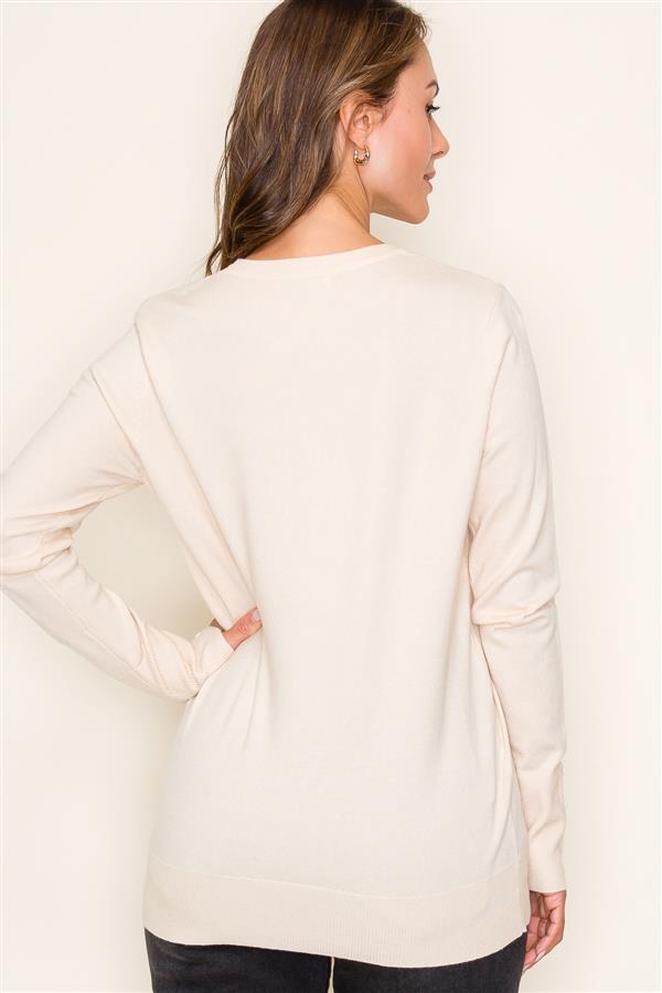 This pullover sweater boasts a crew neck and long sleeves, with button details on the cuffs for a touch of elegance.