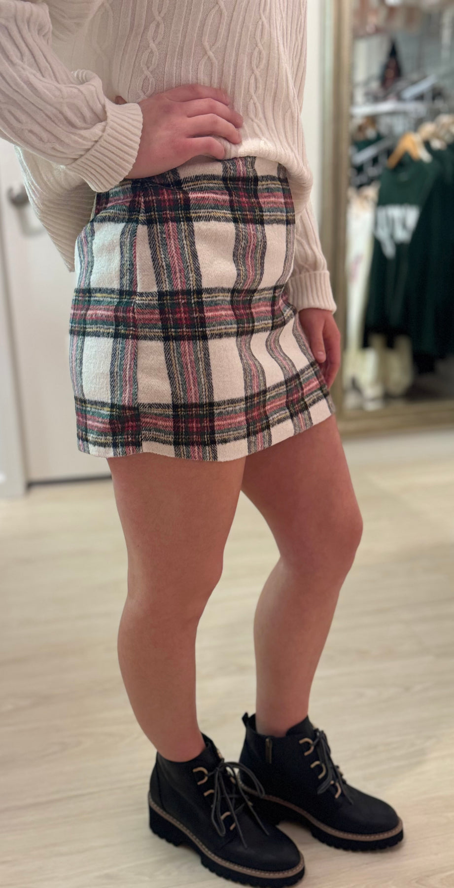 This brushed plaid mini skirt features a side zipper, an elasticized back waist, and a built-in shorts lining for comfort. Versatile enough to style casually or elegantly, it’s an ideal choice for festive occasions.