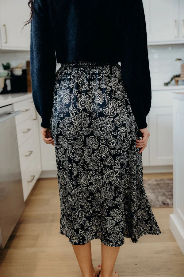 This A-line skirt features a flattering midi length, a comfortable elastic waistband, and convenient pockets, making it a versatile and stylish addition to your wardrobe.