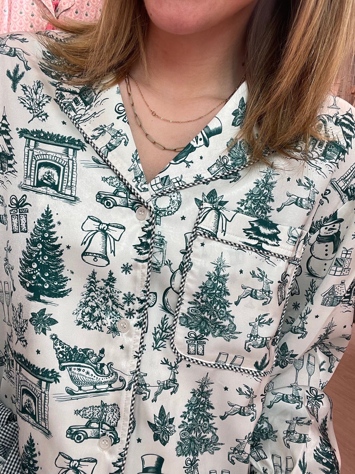 Celebrate the season in silky comfort with this Christmas satin PJ set, complete with charming festive details and delicate gingham bow accents. Elegant, cozy, and playfully holiday-ready, it’s perfect for lounging or gifting!