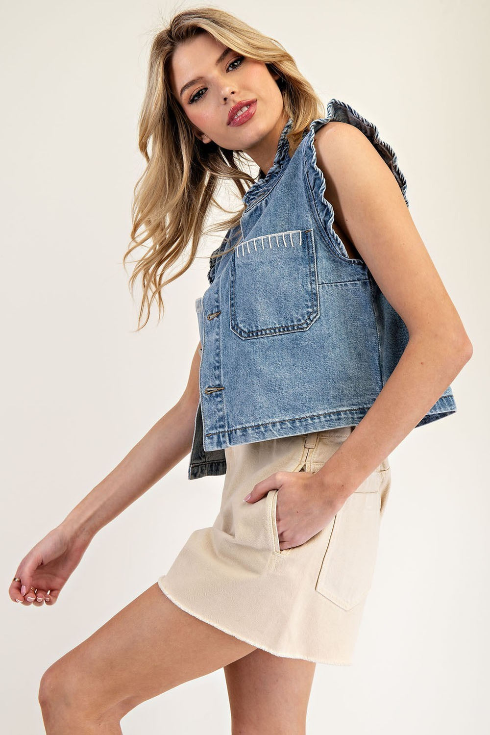 This sleeveless denim vest showcases a button-down front, a ruffled mock neck, and two open chest pockets accented with stitch details. Its ruffled sleeves and cropped length add a stylish, feminine touch to your outfit.