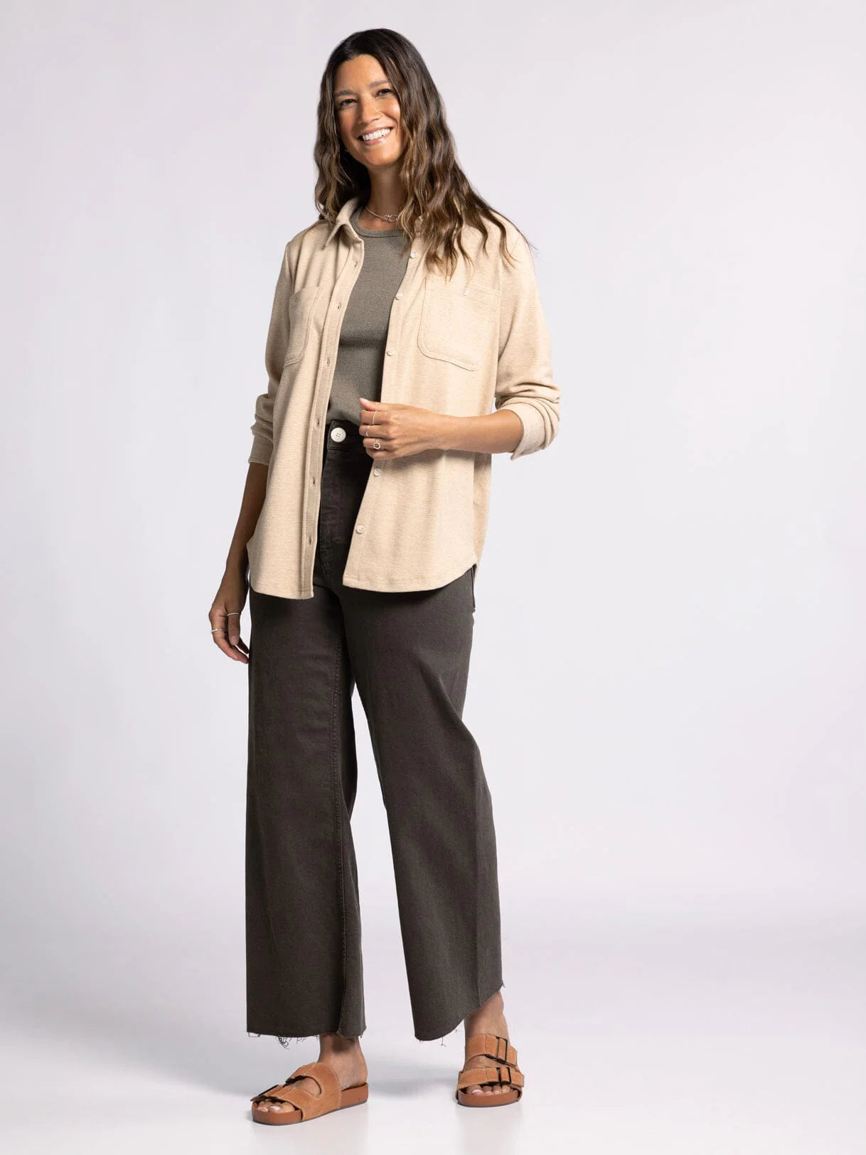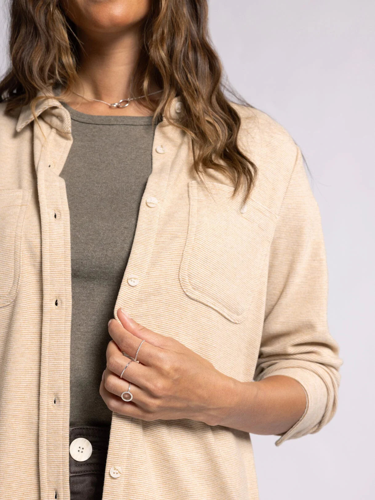 This versatile layering shirt features a classic collared neckline, convenient button-front closure, and two front pockets for added functionality.