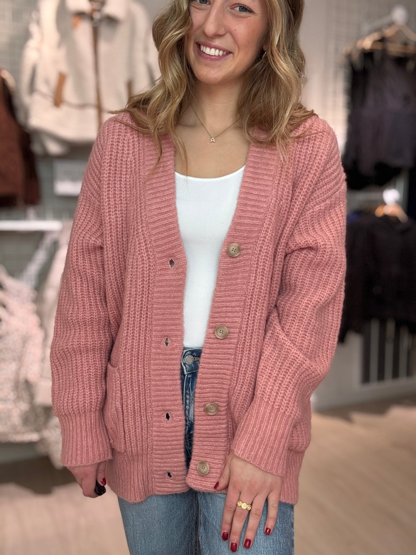 This cardigan boasts a loose, textured design with convenient button closure for an effortlessly stylish and comfortable fit.