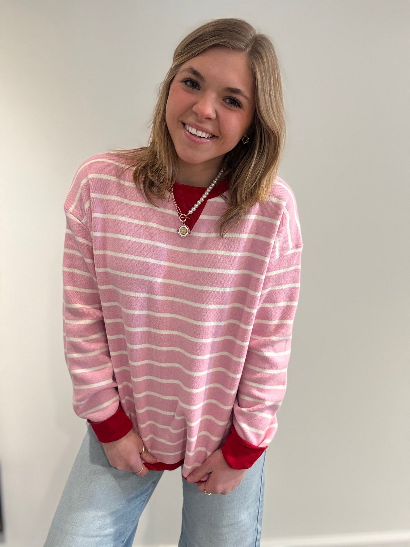 Celebrate love in style with our pink striped crewneck, featuring bold red accents for a playful pop of color. Cozy, cute, and effortlessly chic, this top is the perfect pick for Valentine’s Day—whether you’re out on a date, gifting it to someone special, or just treating yourself to a little self-love.