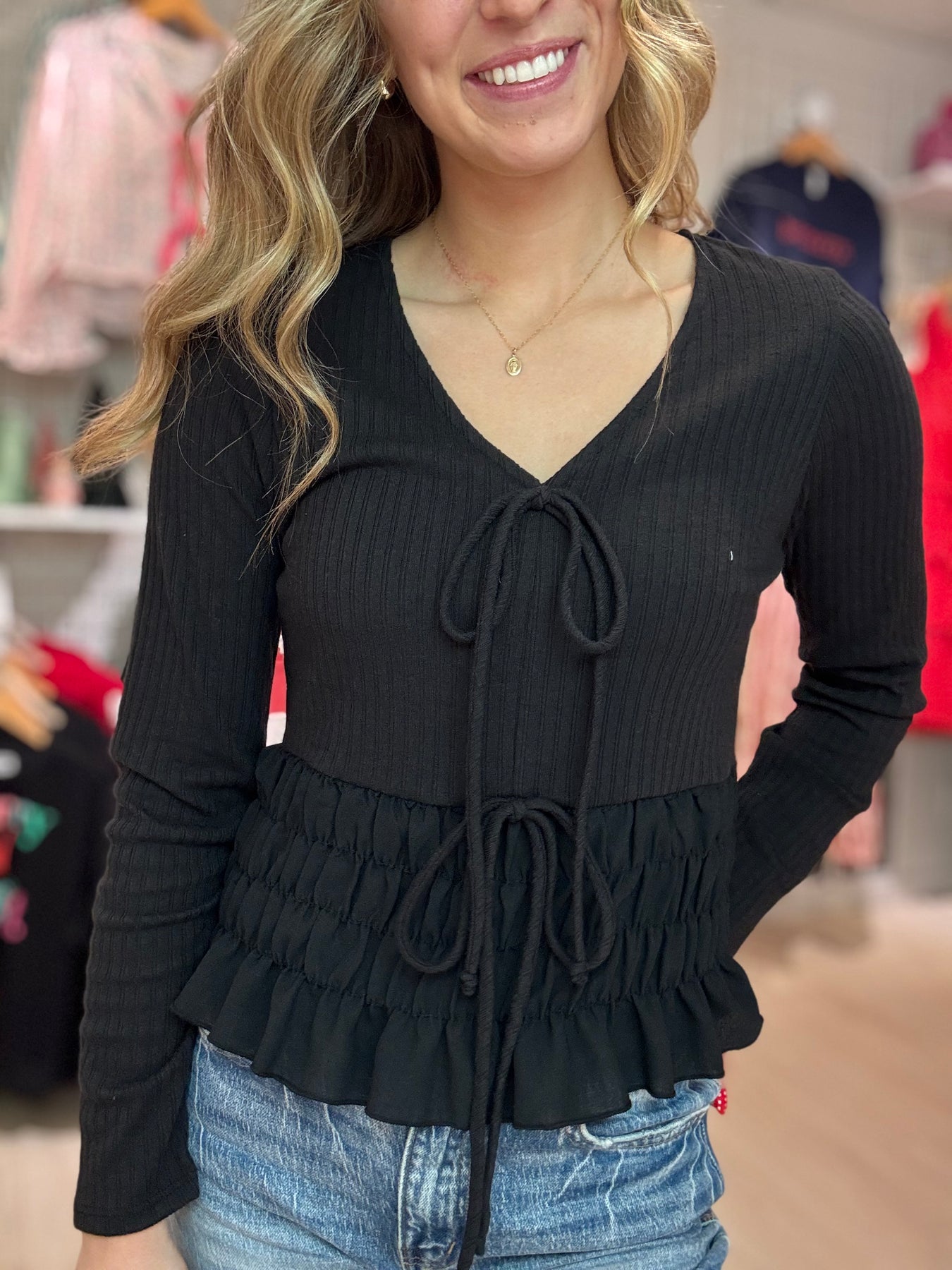 Simple yet stunning! This tie-front black top with a ruffled hem is the perfect piece to take you from day to night in style!