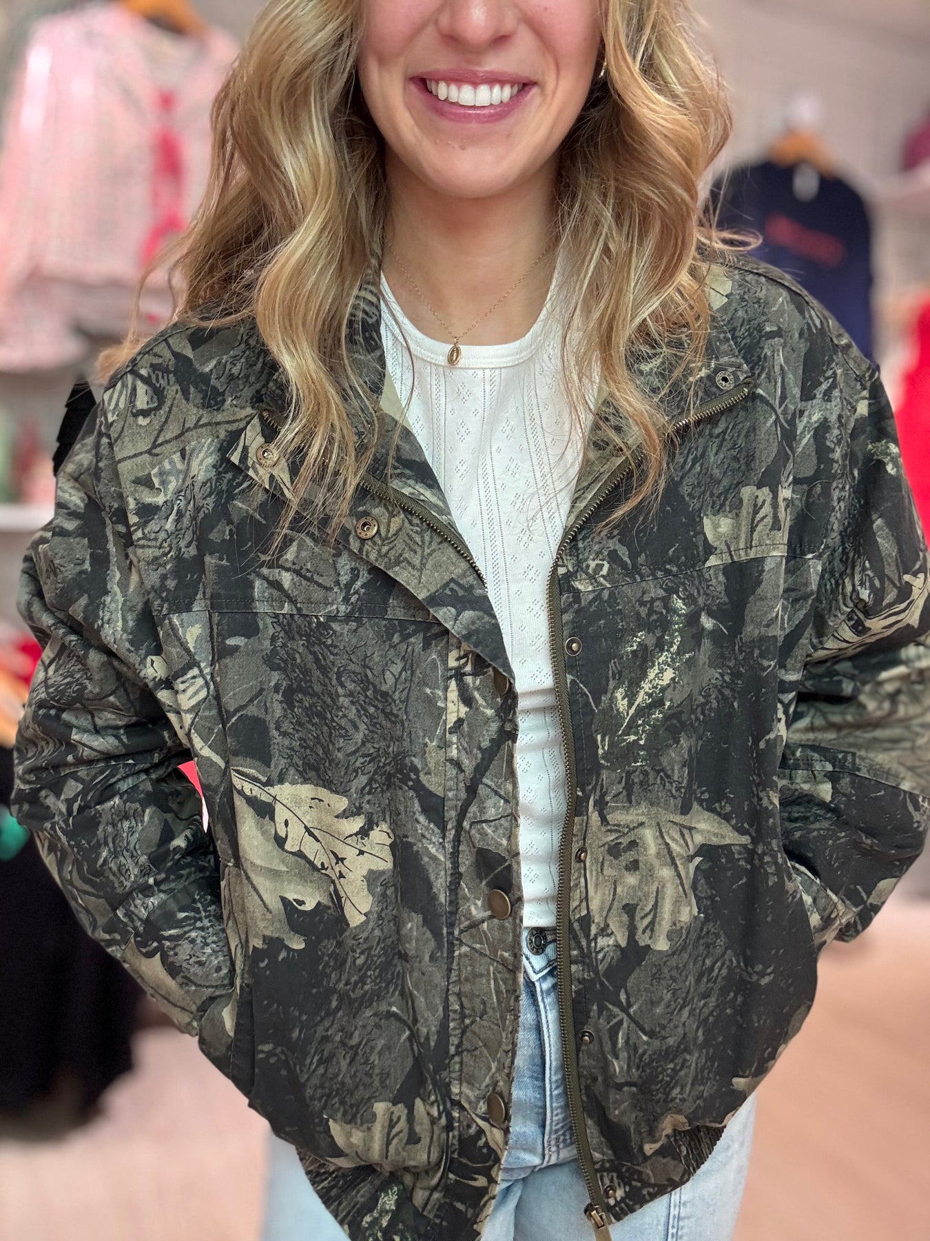 This camo-print bomber jacket delivers an effortlessly rugged, outdoors-inspired look with a modern edge. Its high collar, snap-front detailing, and relaxed fit add structure while keeping things casual, and the earthy tones make it an easy layering piece for everyday streetwear!
