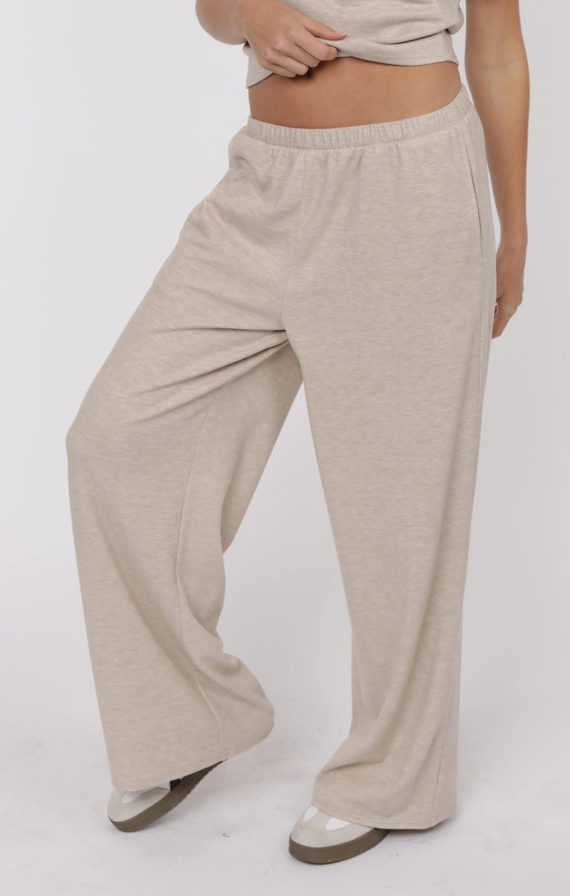 Comfort meets style with these oatmeal-colored knit pants, designed with an elastic waistband for effortless wear. Enhance your outfit by matching them with the coordinating sleeveless top!