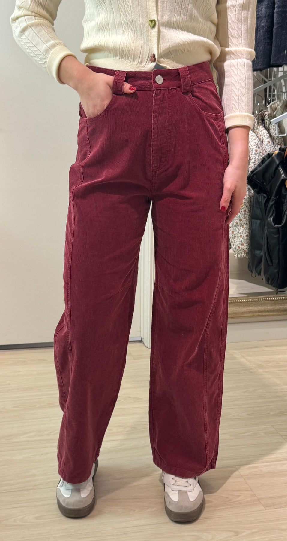 These burgundy corduroy barrel pants feature a relaxed, flattering fit and soft, textured fabric, offering a perfect balance of comfort and style. Ideal for layering with sweaters or dressing up with a blouse, they’re a versatile wardrobe staple with a timeless, cozy feel.