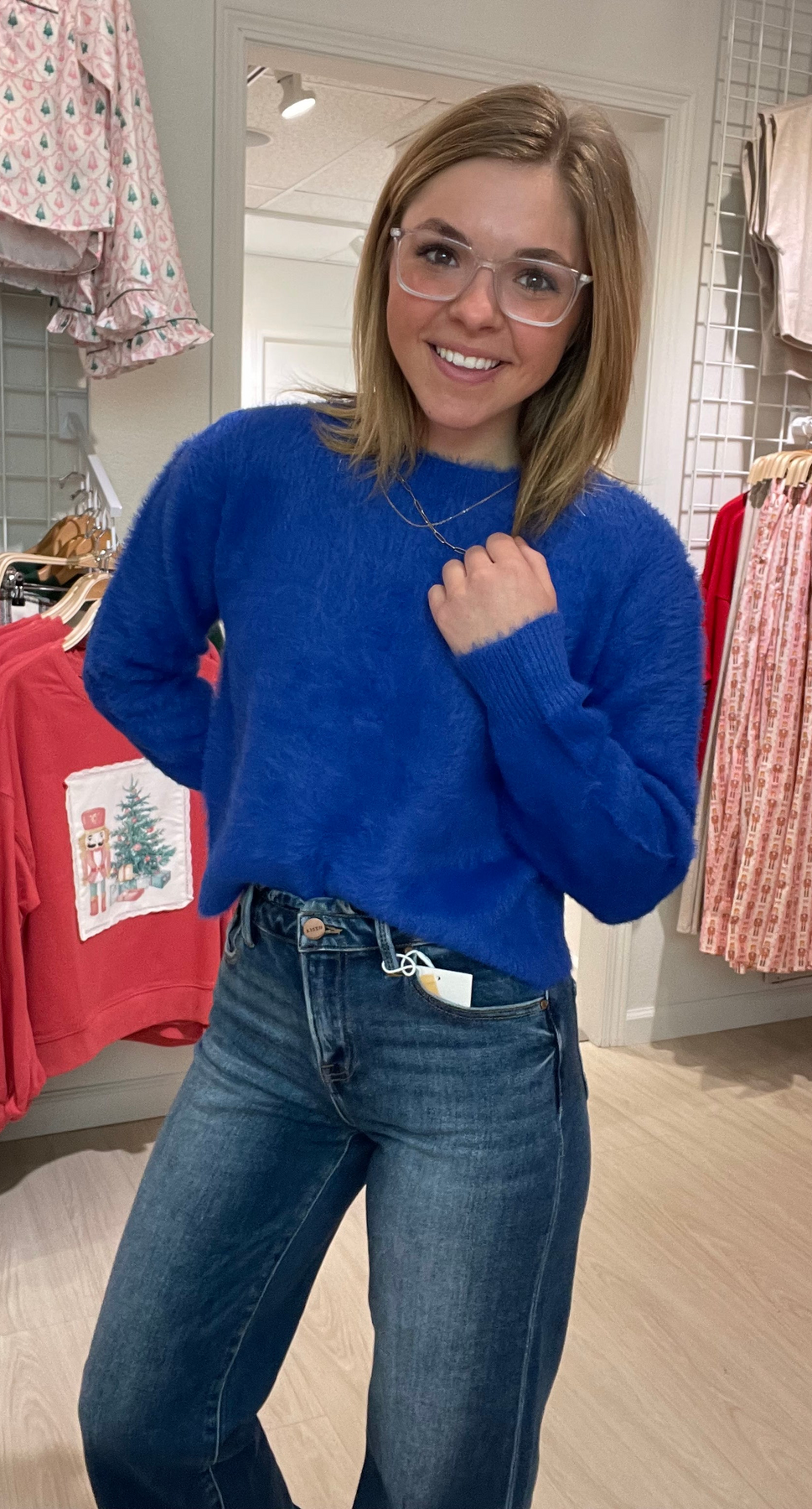 The Fuzz crewneck sweater is a vibrant cobalt blue sweater in a soft, fuzzy eyelash knit. Pair with the Westward in Cobalty blue for a statement monochromatic look.