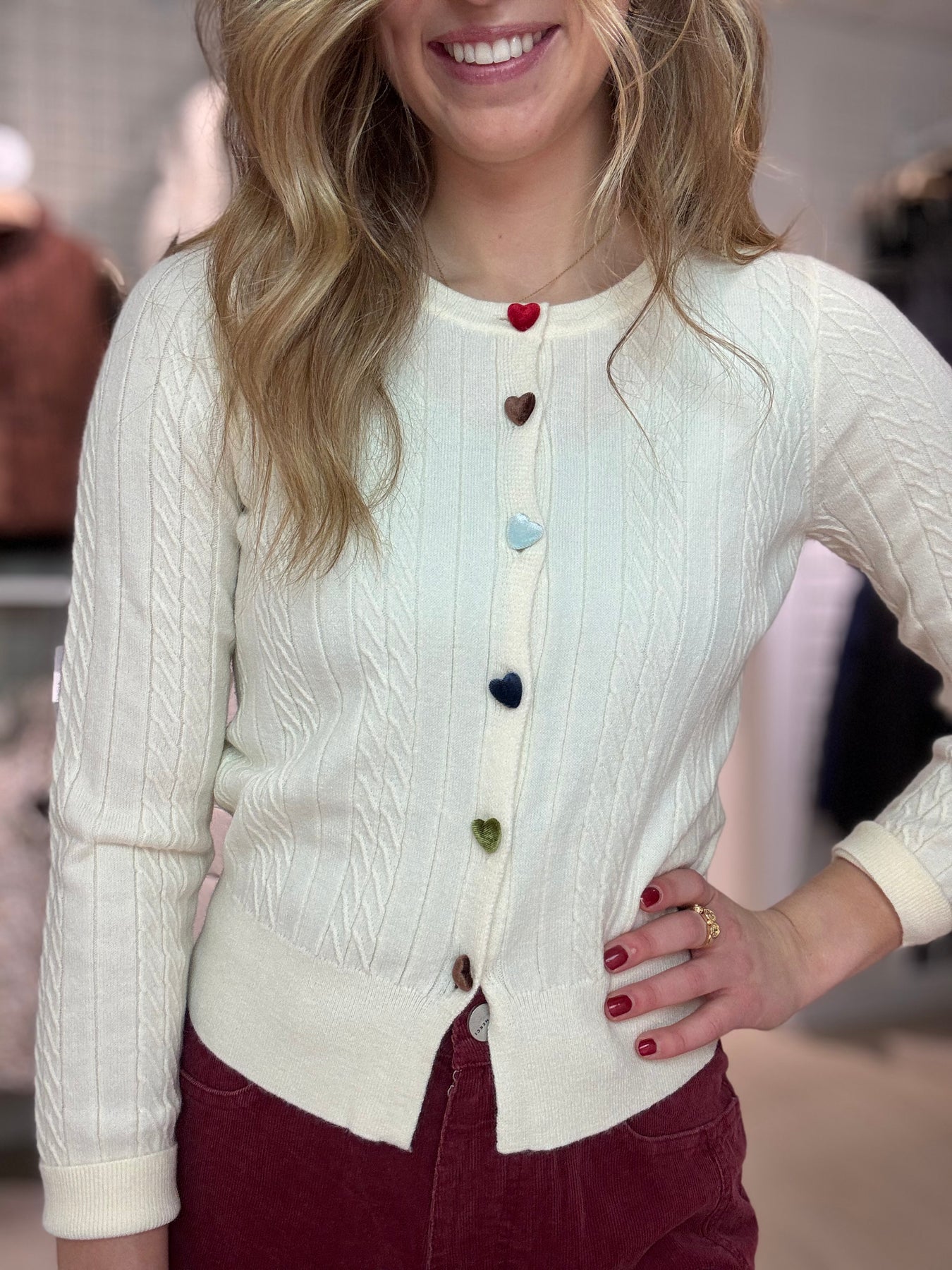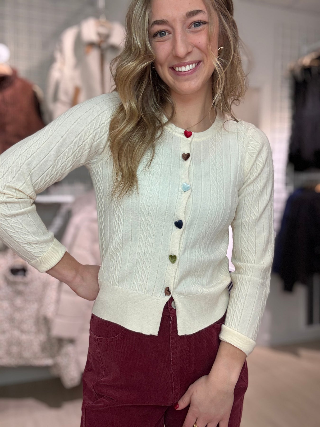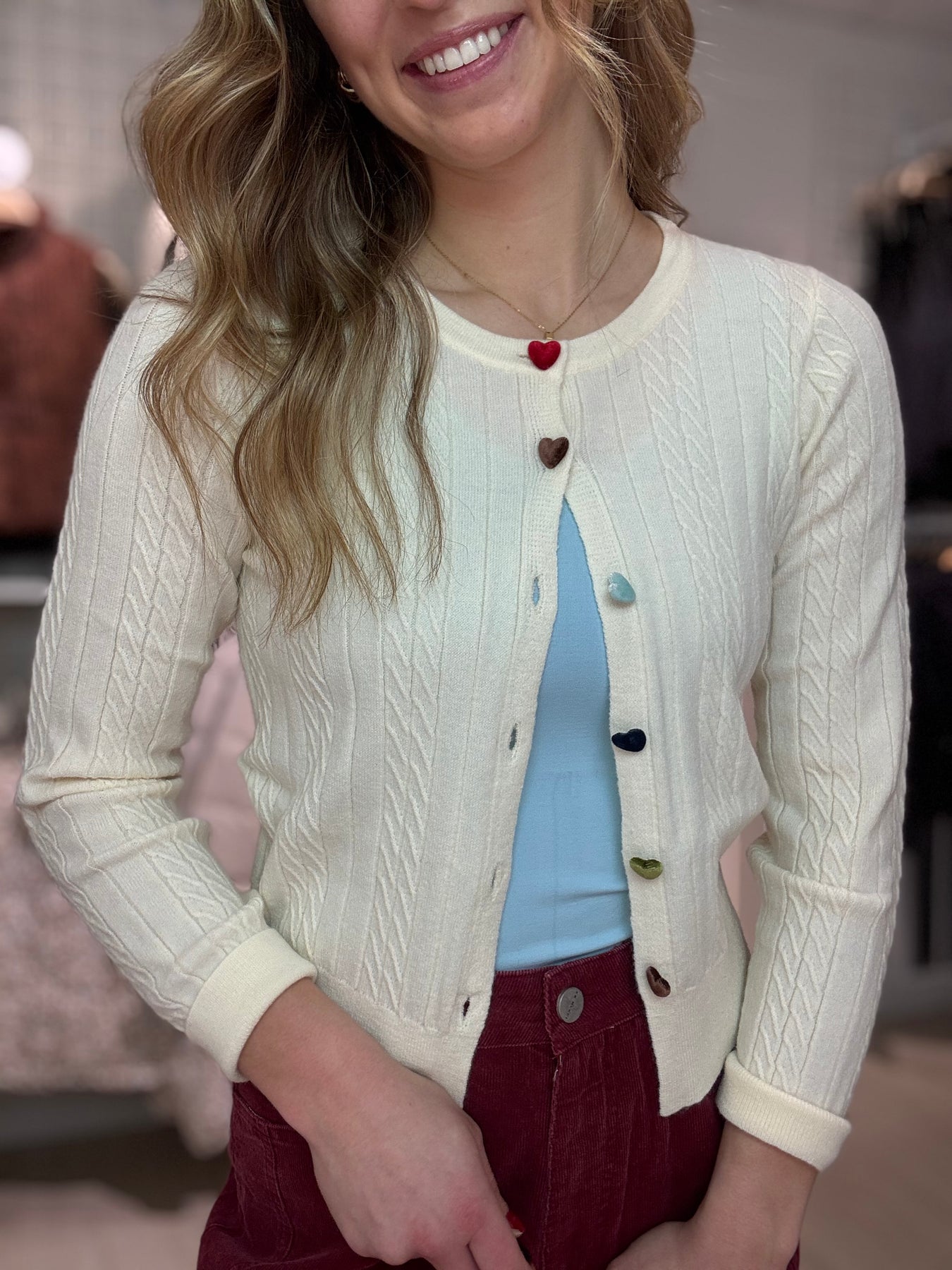 Wrap yourself in sweetness this holiday season with this adorable cream knit cardigan! Soft, cozy, and full of charm, it features a row of rainbow-colored buttons that add the perfect playful touch This cardigan brings a little extra joy and cheer to every outfit!