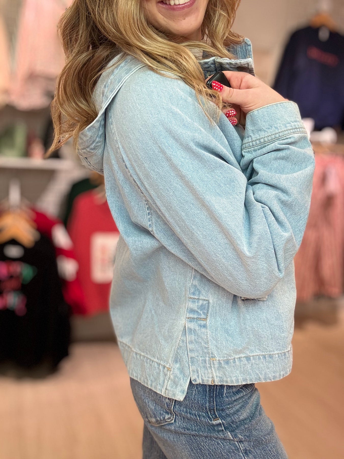 Designed with a relaxed fit, snap-button front, and adjustable drawstrings, it’s the perfect throw-on layer for breezy days. Soft, comfortable, and easy to pair with your favorite essentials—this jacket adds a casual-cool touch to any outfit!