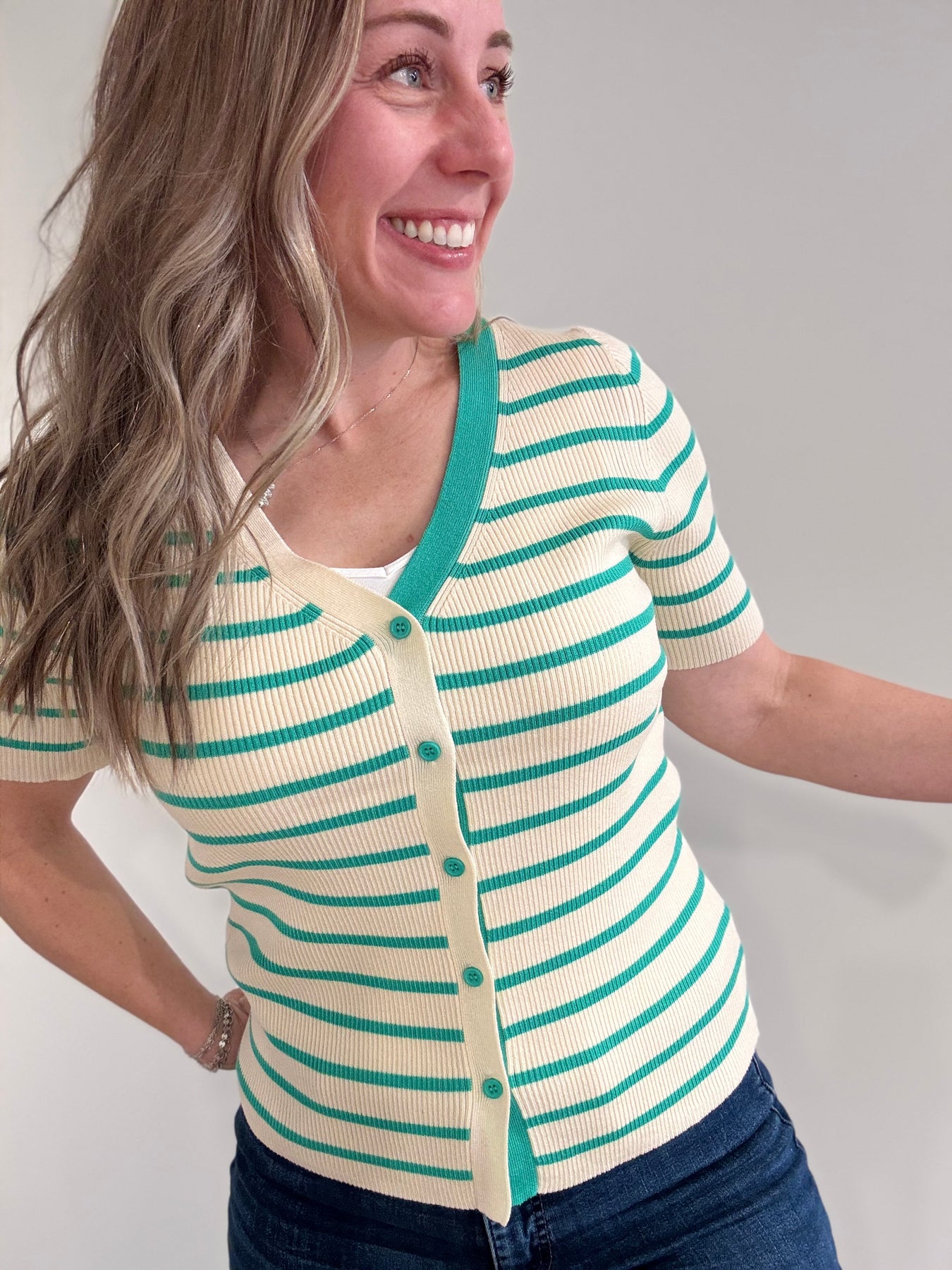 Classic and cozy, this striped short-sleeve cardigan features a ribbed texture and button-up front for a polished yet relaxed look. Perfect for layering over tees or dresses, it adds a touch of effortless style to any outfit. Ivory/Green