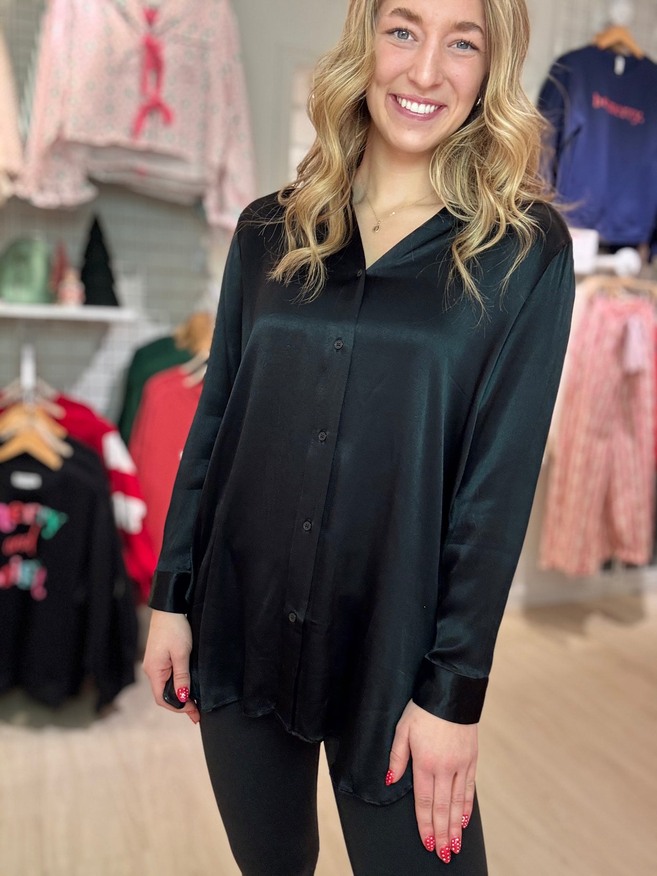 This button-down shirt features a solid color design with an extended bodice for a flattering fit, long sleeves finished with cuffs, and a classic front button closure. Perfect for effortless style and comfort.