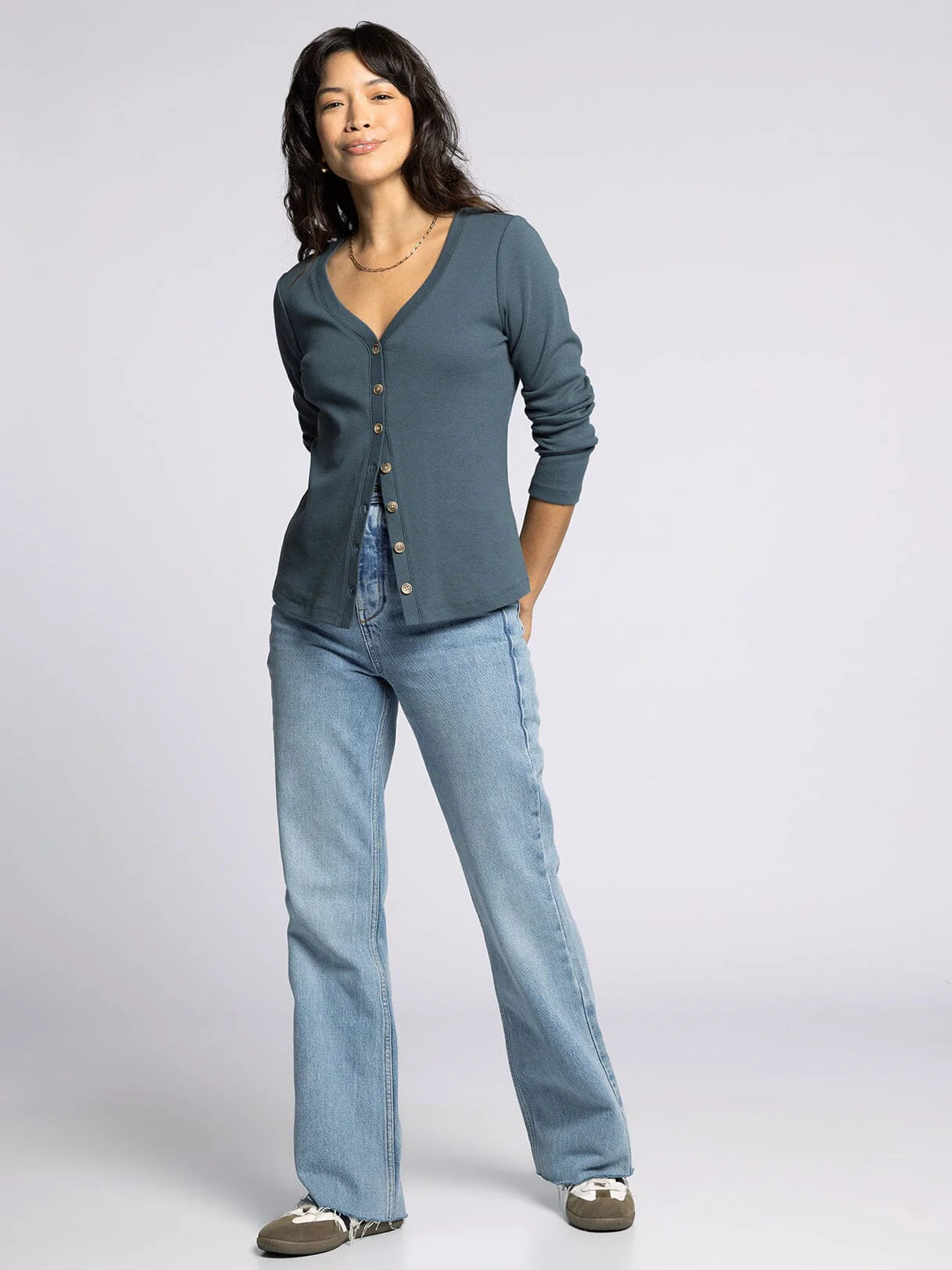 This long-sleeve shirt showcases a stylish V-neck and a complete button-front closure, perfect for adding a touch of sophistication to your look.