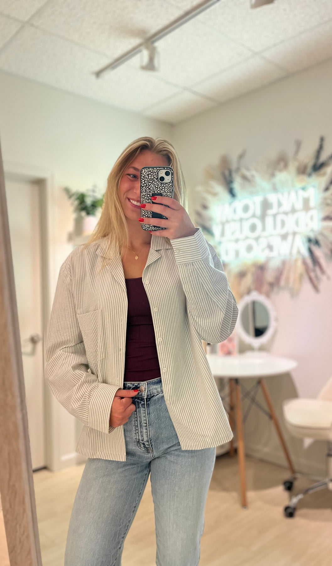 This long-sleeve button-down shirt offers a relaxed fit and a cropped silhouette, complemented by a casual camp collar. Crafted from stripe seersucker fabric, it includes buttoned cuffs and a traditional chest pocket, making it an ideal choice for effortless, comfortable style.