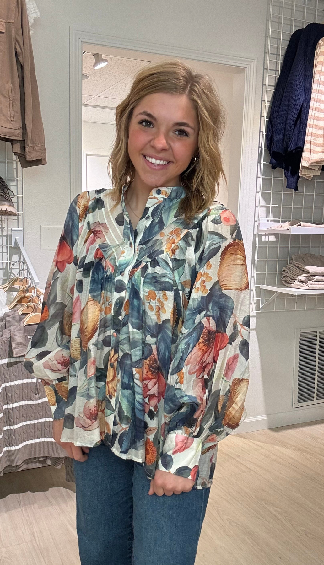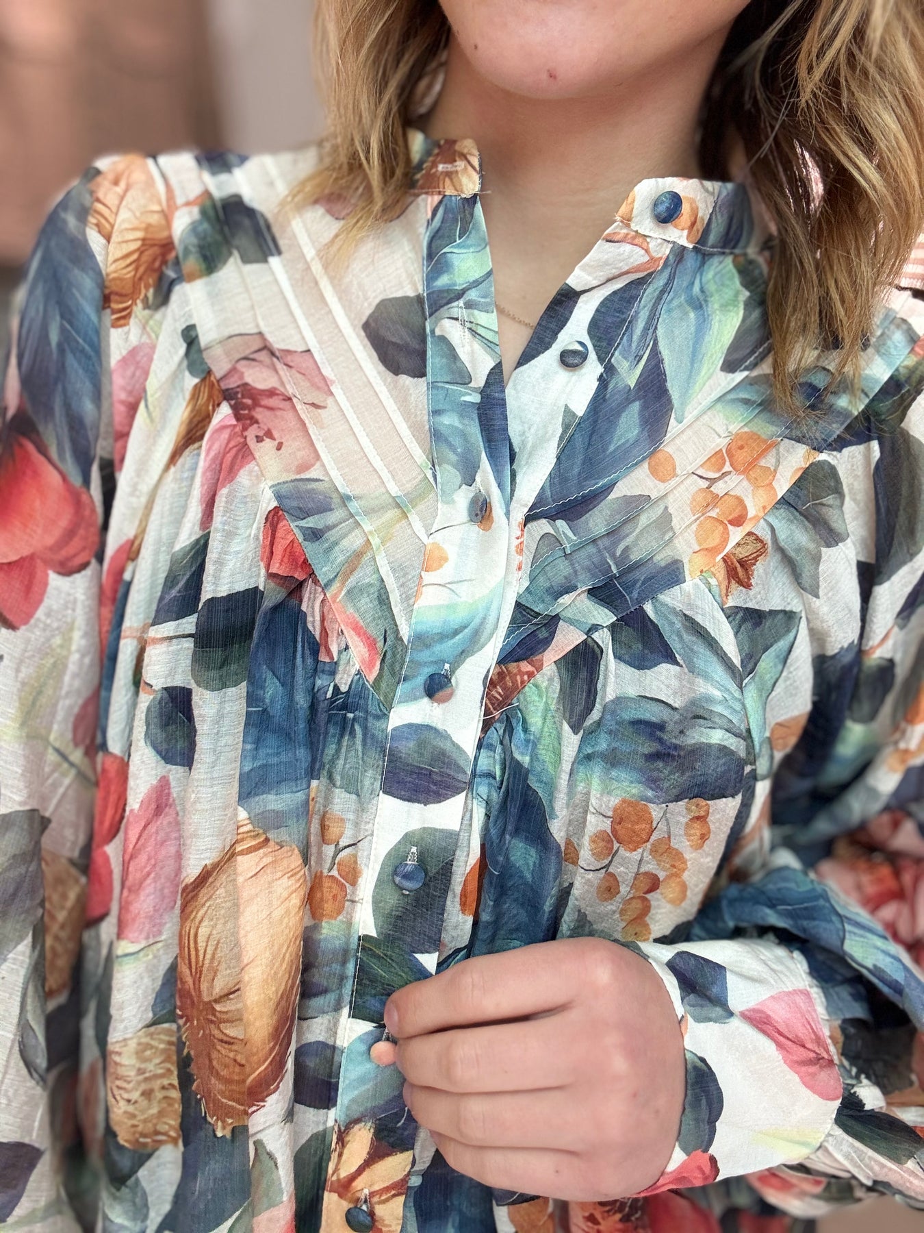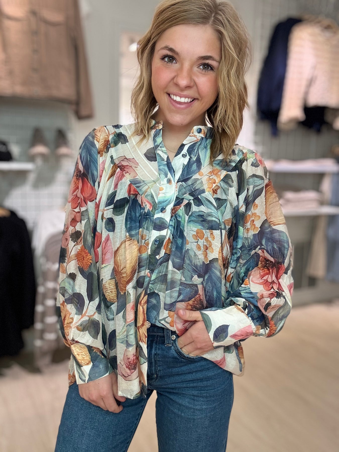 This flowy blouse features a lively floral pattern throughout, a subtle mock neckline with a front slit and delicate pleats, button-down front accents, long balloon sleeves finished with buttoned cuffs, and soft pleats at the back, creating a light and romantic look.