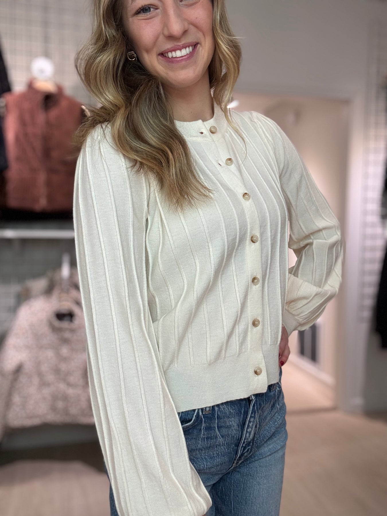 Effortlessly timeless, our ivory ribbed button-up cardigan is a versatile wardrobe essential. Soft, cozy, and elegantly simple, the textured ribbing adds subtle detail while it layers beautifully over tees, blouses, or dresses—perfect for both relaxed weekends and polished everyday looks