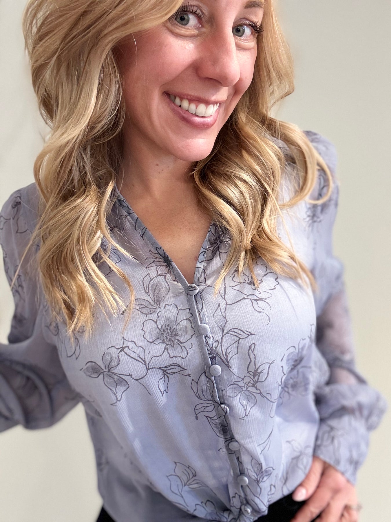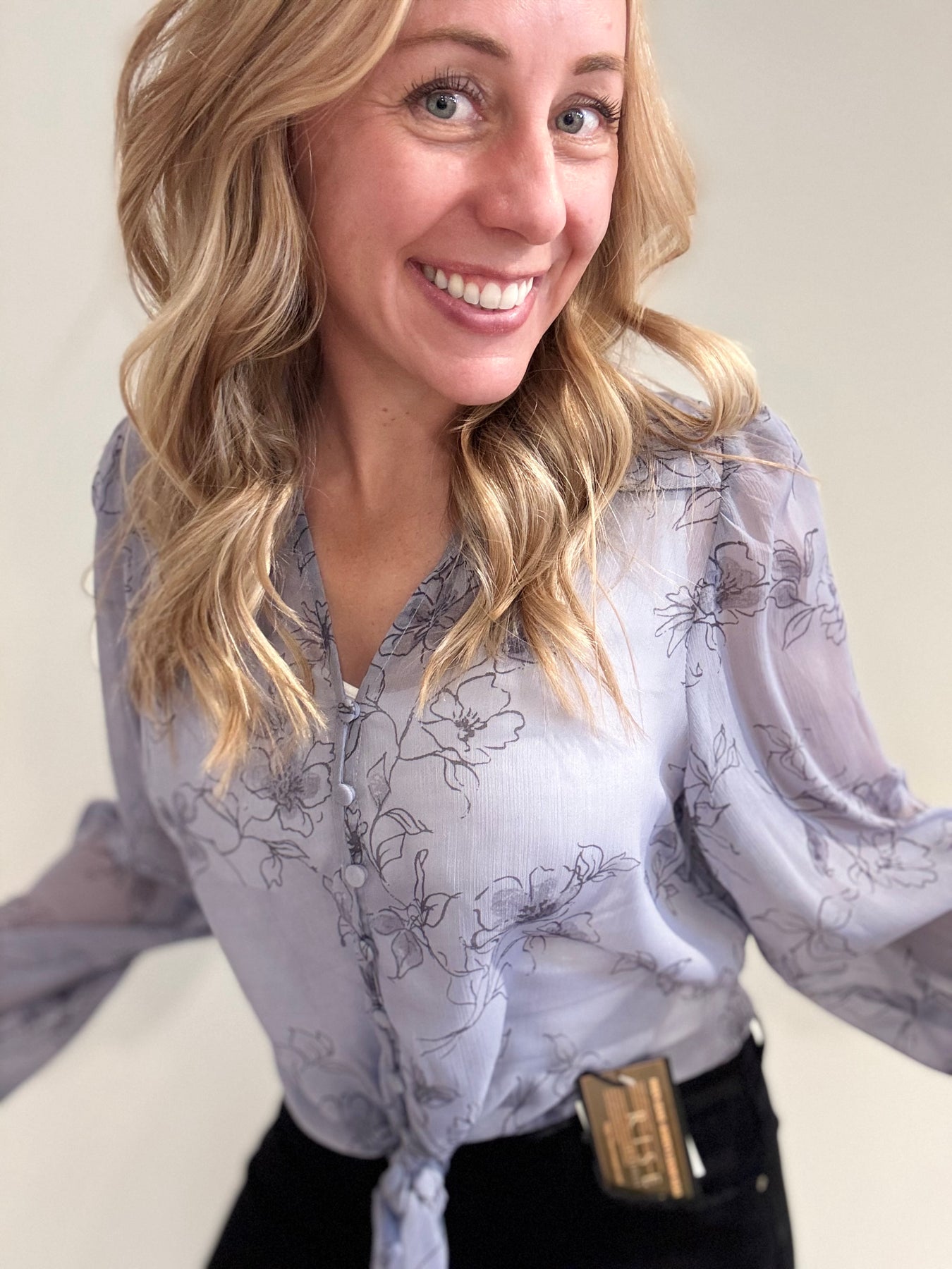 This blouse features delicate black flower details that add a touch of elegance and contrast. The lightweight, semi-transparent fabric gives it a soft, airy feel, while the tie detail at the bottom adds a playful, flattering finish. Perfect for pairing with high-waisted jeans or a sleek skirt for an effortlessly chic look.